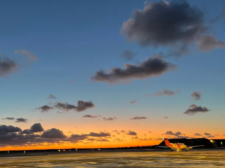 Der er liv i lufthavnen dagen lang fra tidligt om morgenen til sent om aftenen. Det fører ofte til flyvninger i flotte solnedgange, som denne på billedet.